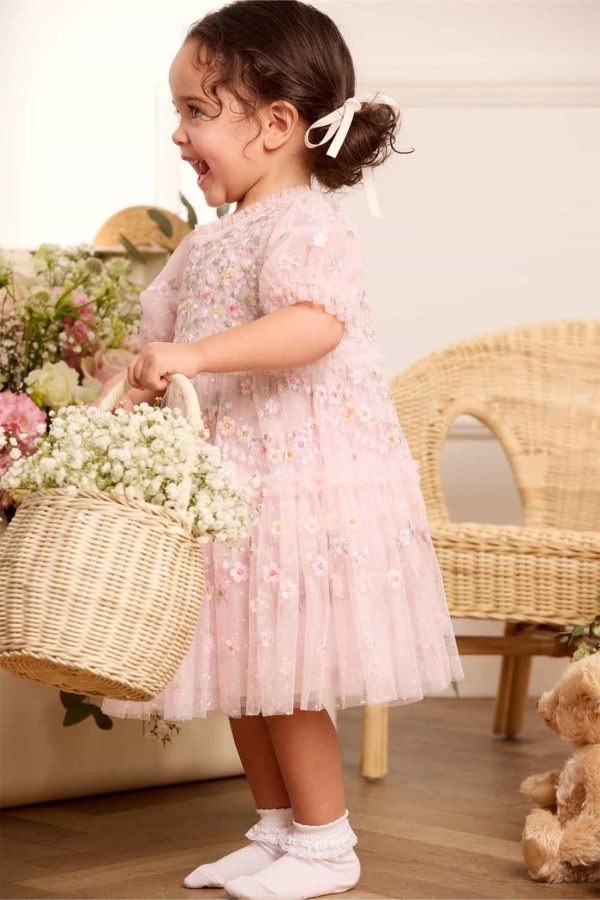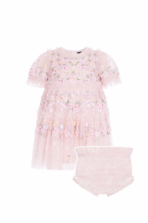 NEW SEASON. The Garland Ribbon Baby Dress in Peony Pink/Multi. This charming dress features Victorian lace-inspired embroidery with pastel floral motifs and white highlights. Delicate ruffled puff sleeves and frills at the neckline and shoulders add a sweet touch. The gathered skirt hem is finished with a playful frill for added volume. Lined in soft cotton voile for comfort,the set includes matching cotton dobby bloomers with frilled edges. The perfect dress for your little one’s upcoming special occasion.