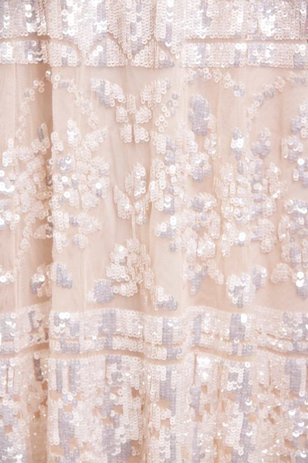 The Aurora Gown in Cream. A signature Needle & Thread style from the archive,this timeless gown draws inspiration from antique tablecloths of the early 1900s. Intricately crafted with a shimmering placement border of sequins,it celebrates the art of vintage craftsmanship. The elegant silhouette features a round neckline,slim long sleeves,and delicate tulle frills at the neckline and armholes—a hallmark of the brand. Finished with layers of soft,romantic tulle,this heritage piece captures classic beauty with a modern edge.
