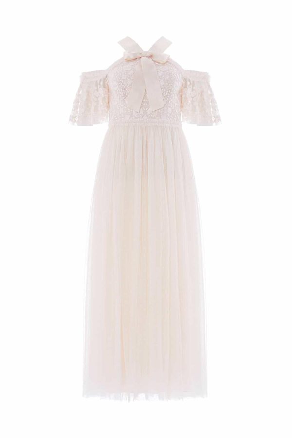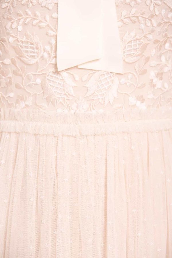 The Primrose Bodice Ankle Gown in Cream. This gown features delicate tonal embroidery on the bodice,inspired by antique lace. Designed with satin ribbon straps and a bow elegantly accent the neckline,while cold shoulder detailing and romantic fluted sleeves add a feminine touch. The skirt,crafted from layers of soft Needle & Thread tulle,creates a dreamy,romantic silhouette. A versatile gown perfect for any occasion.