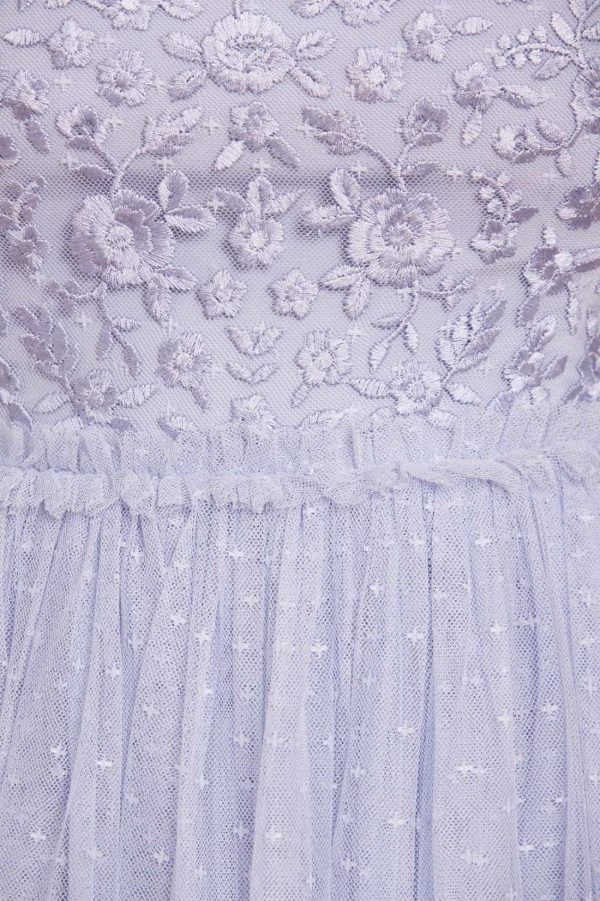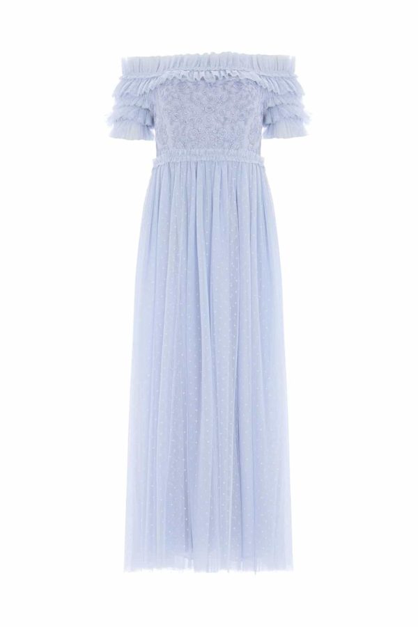 The Midsummer Lace Bodice Off Shoulder Ankle Gown in Iris Blue. This gown is an update of our bestselling signature style. Beautifully developed with layers of soft,delicate tulle and an off-the-shoulder shape to create a romantic silhouette. The bodice is scattered with vintage-inspired embroidered motifs for a signature Needle & Thread look. The perfect style for a bridesmaid or special event.