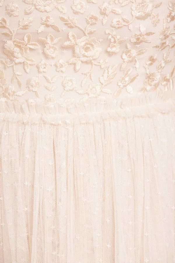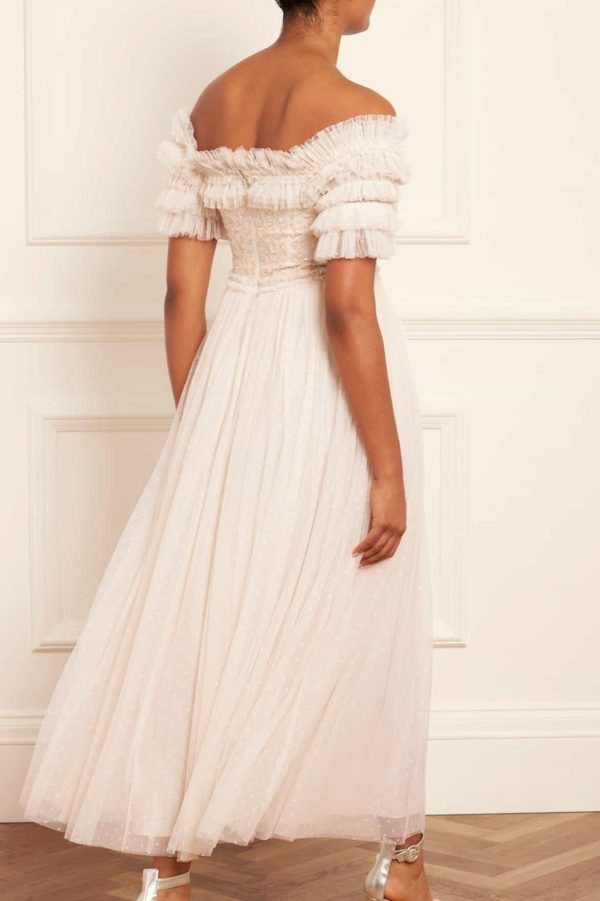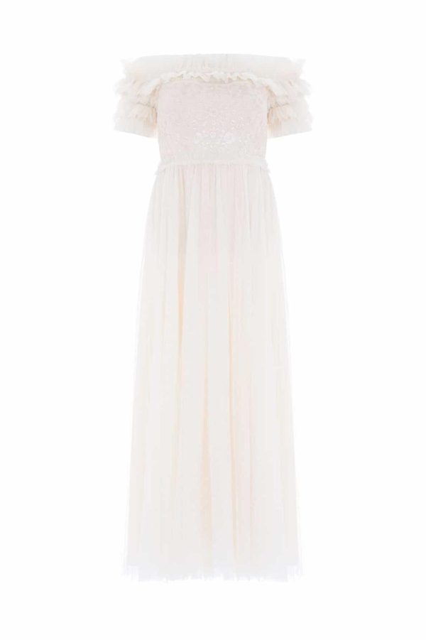 The Midsummer Lace Bodice Off Shoulder Ankle Gown in Cream. This gown is an update of our bestselling signature style. Beautifully developed with layers of soft,delicate tulle and an off-the-shoulder shape to create a romantic silhouette. The bodice is scattered with vintage-inspired embroidered motifs for a signature Needle & Thread look. The perfect style for a bridesmaid or special event.