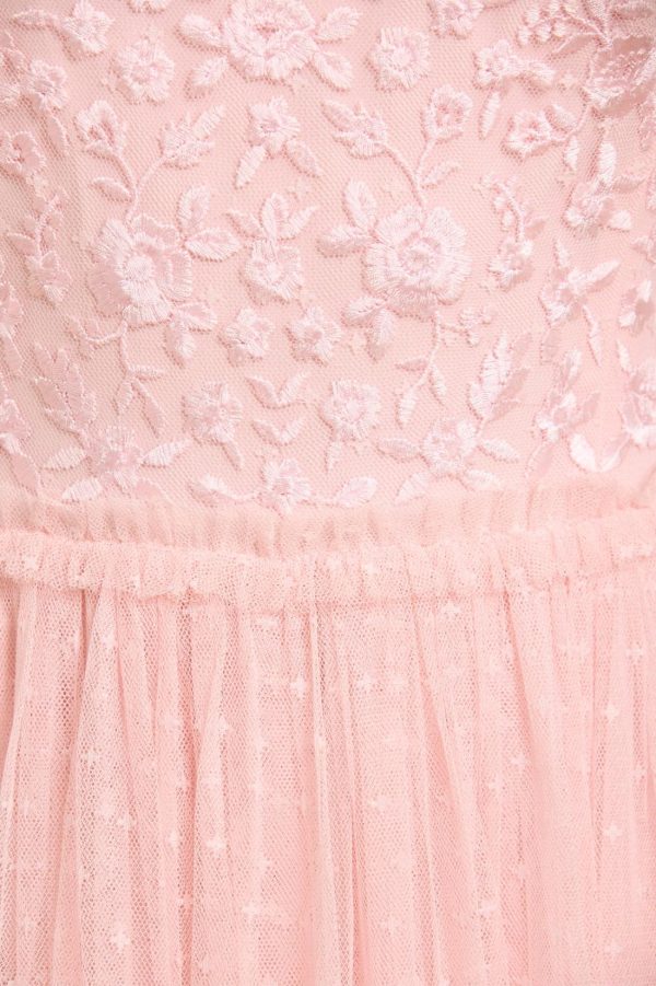 The Midsummer Lace Bodice Off-Shoulder Ankle Gown in Dusk Pink. This gown is an update of our bestselling signature style. Beautifully developed with layers of soft,delicate tulle and an off-the-shoulder shape to create a romantic silhouette. The bodice is scattered with vintage-inspired embroidered motifs for a signature Needle & Thread look. The perfect style for a bridesmaid or special event.