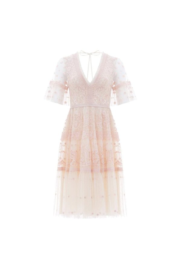 Midsummer Lace Dress in Champagne/Ballet Slipper. A signature Needle and Thread style,updated for the new season ahead. Taking inspiration from Victorian lace,the Midsummer features intricately embroidered artwork in romantic colours on delicate tulle. Lace trims border the neckline and frame each tier of the skirt. This embroidered lace dress has sheer,romantic sleeves and our signature grosgrain ribbon at the waist. The perfect dress to take you from day to night.