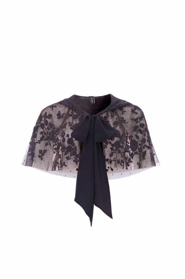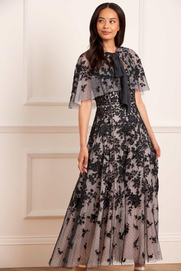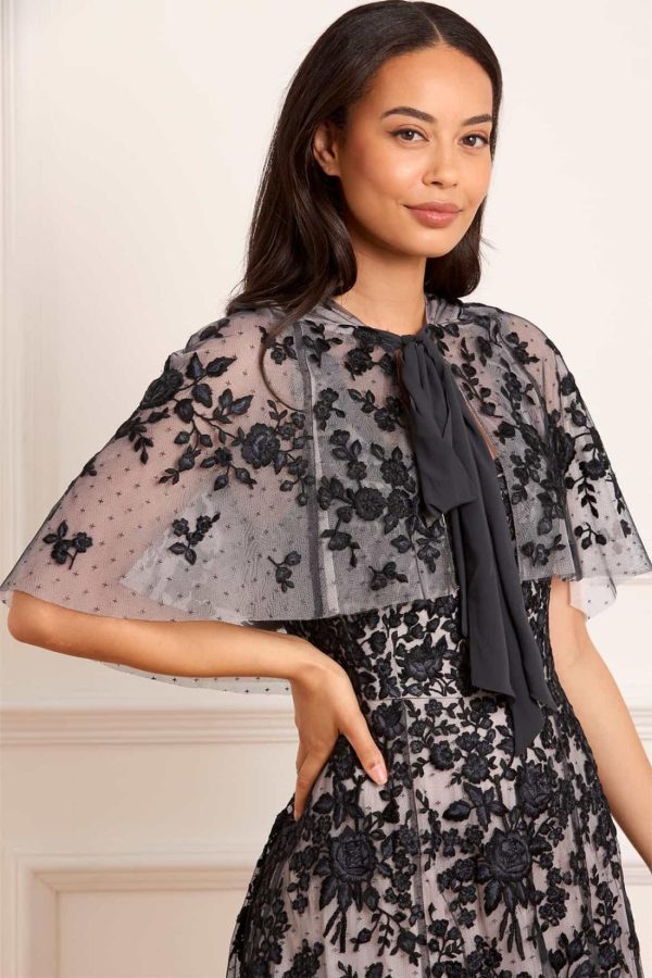 NEW SEASON. The Rosa Hooded Short Cape in Graphite/Opal. This cropped embroidered cape is designed to complement the matching Rosa Scoop Neck Ankle Gown. Adorned with bold rose and ditsy motifs,the cape fastens with a soft chiffon bow at the neckline. Perfect for making a dramatic and romantic statement.