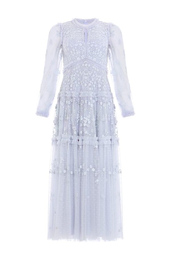 The Autumn Lace Long Sleeve Ankle Gown in Dusk Blue. This signature Needle & Thread style is designed with floral motif embroidery inspired by antique lace designs. This gown is developed with romantic sheer long sleeves,and a gathered tiered hem,and is created from layers of soft tulle to create a flattering silhouette. A classic and contemporary style.