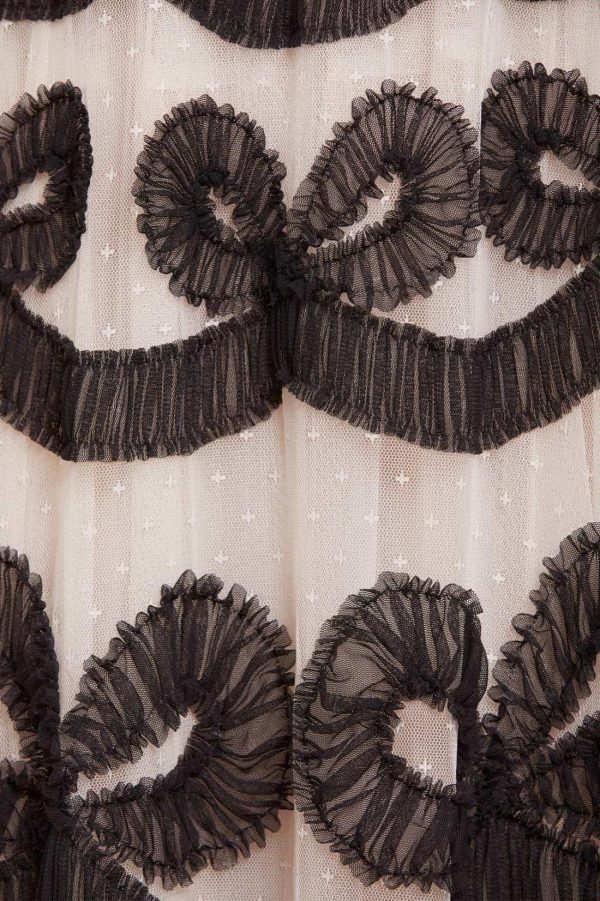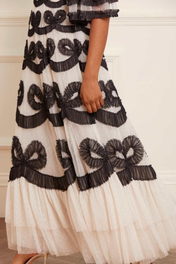The Ingrid Gown in Cream / Graphite. This iconic Needle & Thread style is inspired by vintage ribbon bows. Beautifully engineered with delicate tulle and subtle texture to capture this ribbon motif. This signature Needle & Thread monochrome gown is bold yet truly romantic.
