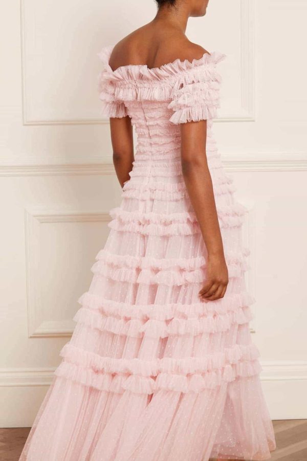 The Lisette Ruffle Off Shoulder Gown in Peony Pink. This statement gown has an elegant off-the-shoulder design inspired by Hollywood styling. Crafted with textile tulle and double-stitched frills for a dramatic,romantic effect. Features an integrated corset for a perfect fit and to hold the silhouette. Expect all eyes on you in this romantic gown.
