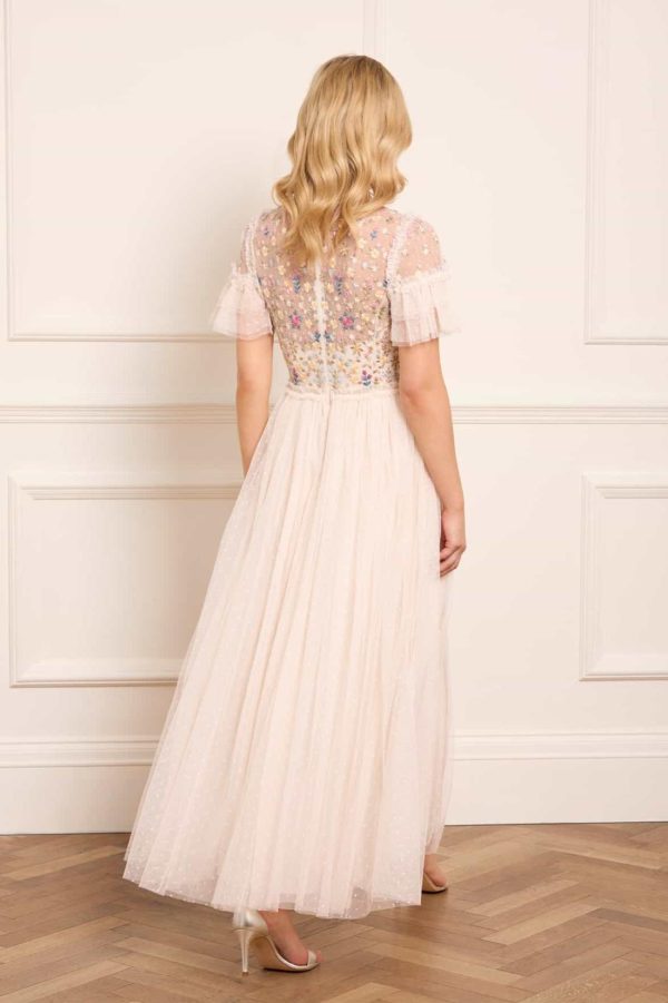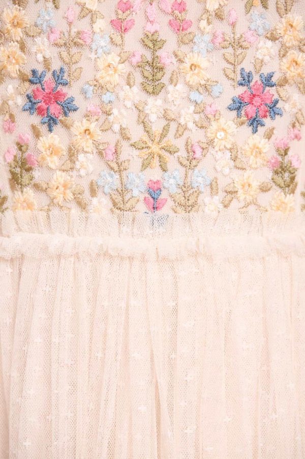The Flowerbed Embroidery Bodice Round Neck Ankle Gown in Cream/ Moonshine is a pretty gown featuring intricate floral embroidery on the bodice,inspired by antique lace. The round neckline is elegantly trimmed with signature Needle & Thread tulle at the neckline,waist,and shoulders for a romantic touch. Developed with fluted sleeves,crafted from layers of tulle frills and delicate floral motifs,add a refined finish. The soft tulle skirt drapes beautifully,creating a graceful,romantic silhouette. A perfect combination of classic and contemporary style for any special occasion.