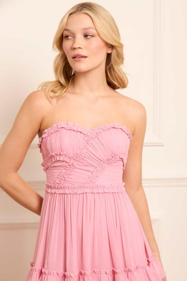 The Isabel Chiffon Strapless Ankle Gown in Sugar Pink is a heritage Needle & Thread style. The bodice features intricate,ruched chiffon with signature ruffles and an internal corset for comfort and shape. The ethereal skirt has gently gathered tiers,each edged with topstitched frills for a romantic touch. Crafted from soft,semi-sheer chiffon,the gown offers a flowing silhouette and is fully lined for easy wear. A timeless addition to your wardrobe.