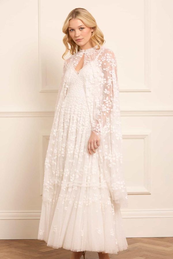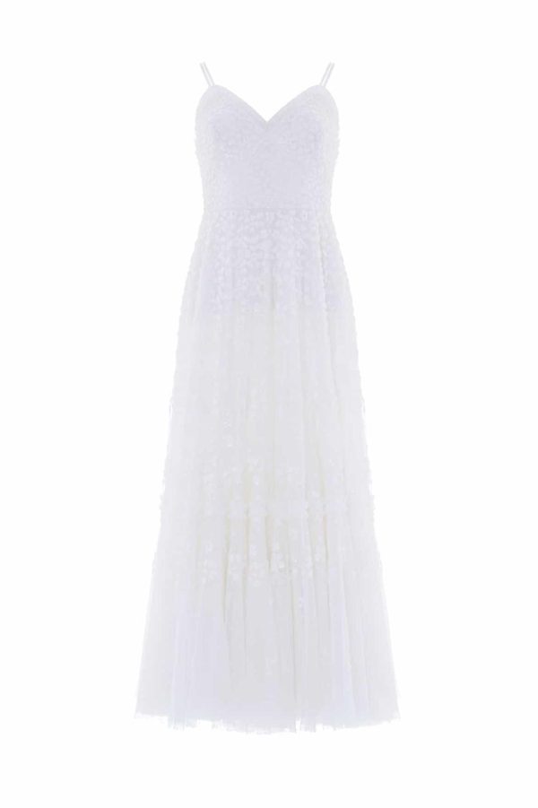 NEEDLE & THREAD EXCLUSIVE. The Maeva Cami Ankle Gown in Swan White reintroduces a signature Needle & Thread design,featuring floral sequin motifs on the bodice and trailing borders fading towards the hem. The high-shine sequins offer a lustrous finish. Developed with an elegant cami neckline,slim straps,and a softly gathered skirt tier with frothy ruffles,this gown exudes romantic charm. Layers of net and tulle create a voluminous skirt,finished with a sweeping hemline—a timeless piece to cherish.