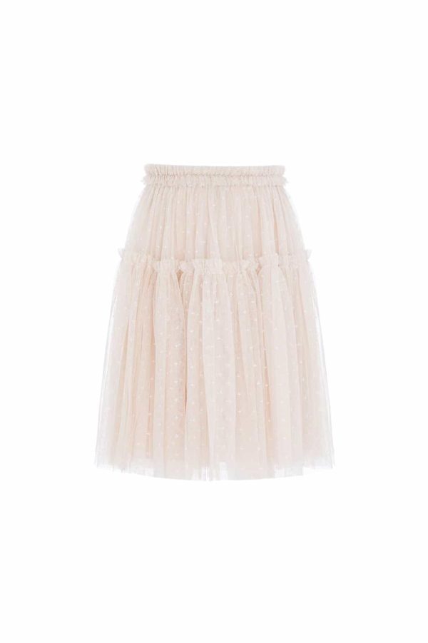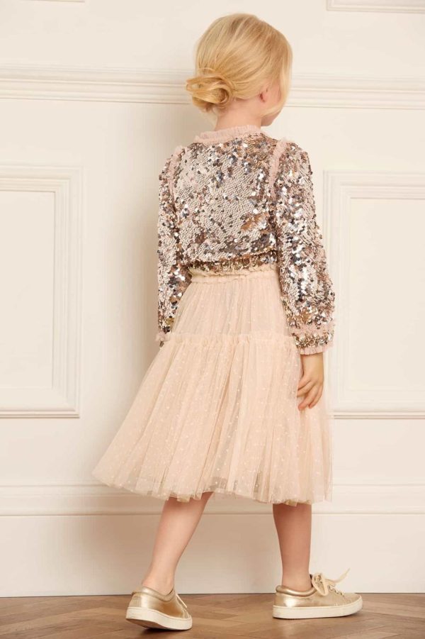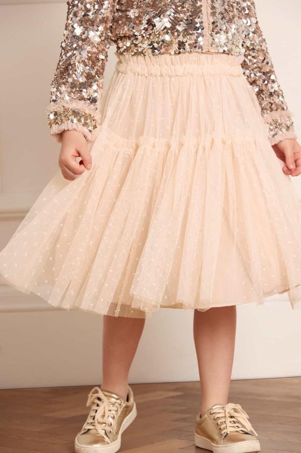 The Tulle KIDS Skirt in Dust Beige. The skirt is developed with layers of net and tulle for a floaty,playful hemline. Designed with a tiered hem frill for extra frothy,voluminous styling—perfect for twirling. Adorned with signature Needle & Thread frills at the waistband and skirt tier. Designed to be styled with our Hallie Kids Bomber Jacket,to create the perfect statement party co-ord.