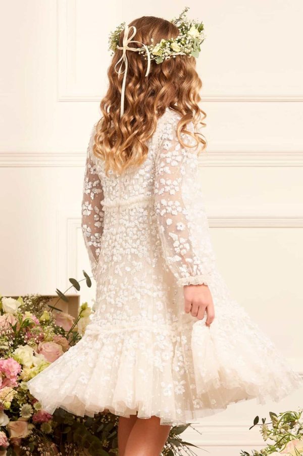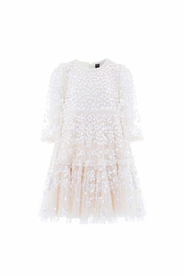 NEEDLE & THREAD EXCLUSIVE. The Maeva Long Sleeve Kids Dress in Cream is a Needle & Thread exclusive,featuring floral sequin motifs on the bodice and trailing floral borders fading towards the hem. Designed with foil-coated sequins add a lustrous shine,while the gathered skirt tier with a frothy ruffle gives it volume for twirling. Delicate tulle frills at the neckline,shoulders,and yoke complete this timeless,heritage-inspired design.