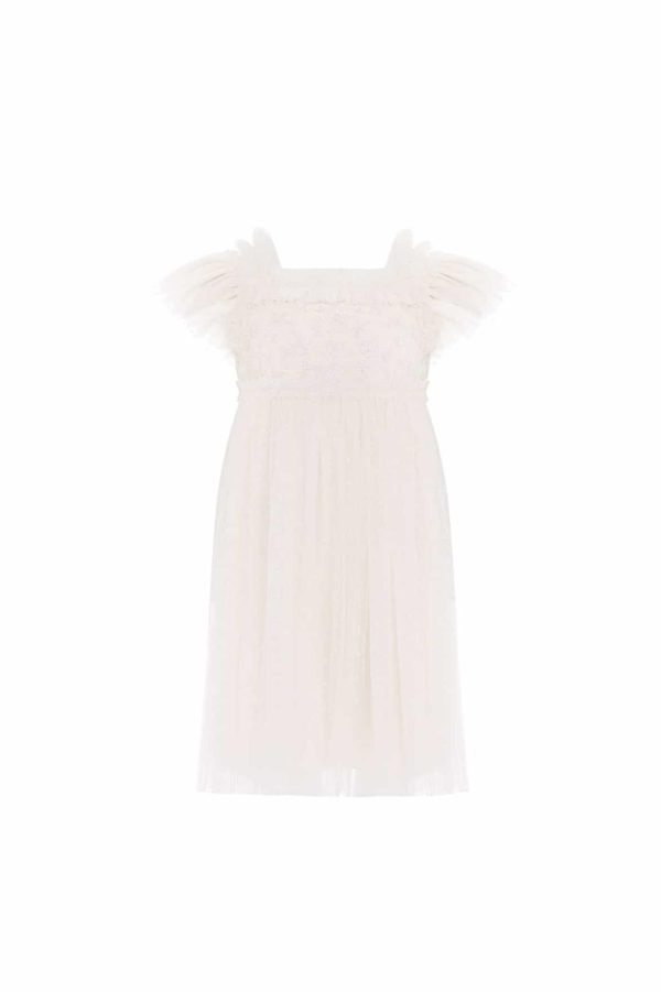 The Midsummer Lace Bodice KIDS Dress in Cream. Inspired by one of our bestselling signature styles,this pretty dress features ruffles around the neckline created from layers of soft,delicate tulle. Beautifully designed with intricate tonal embroidery in vintage lace inspired motifs. The skirt is made with layers of signature Needle & Thread soft tulle. The perfect dress for a flower girl moment or a special occasion.
