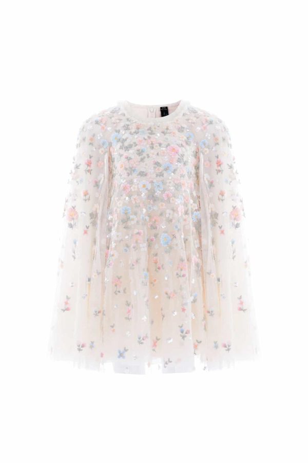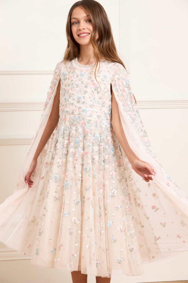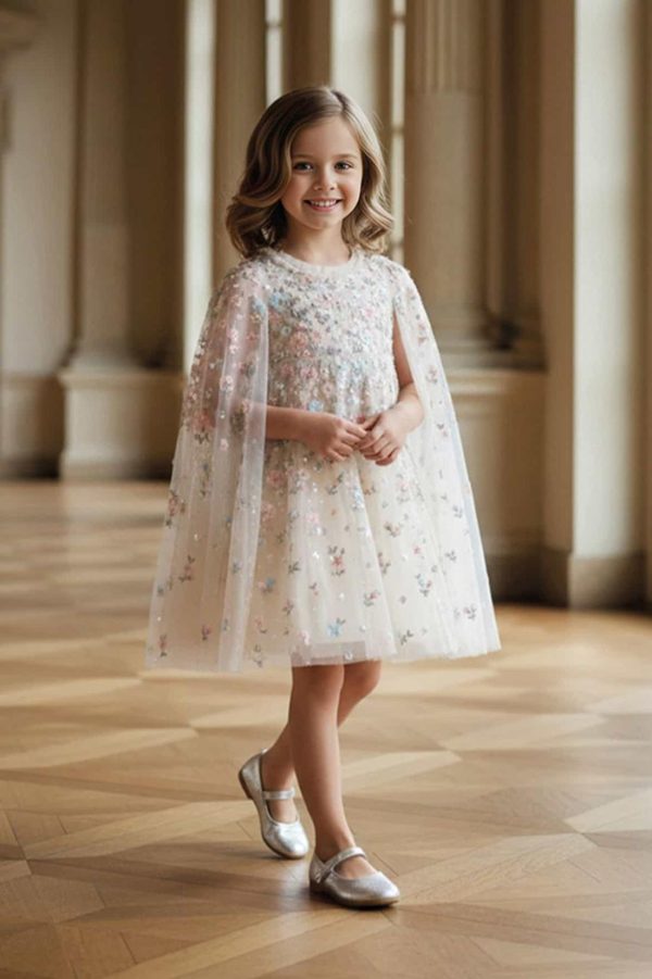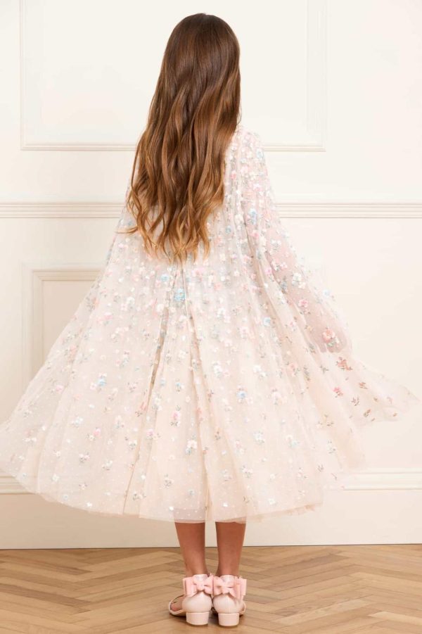 The Dahlia Ditsy Cape Kids Dress in Cream/Multi. This enchanting dress features shimmering sequin dots and delicate floral embroidery. A soft tulle cape,adorned with floral motifs,adds a whimsical touch. With layers of net and tulle for a twirl-worthy skirt,it’s the perfect fairytale dress for your little one’s special occasions.