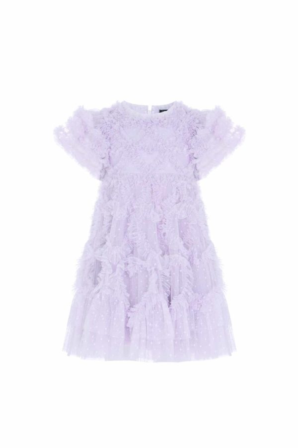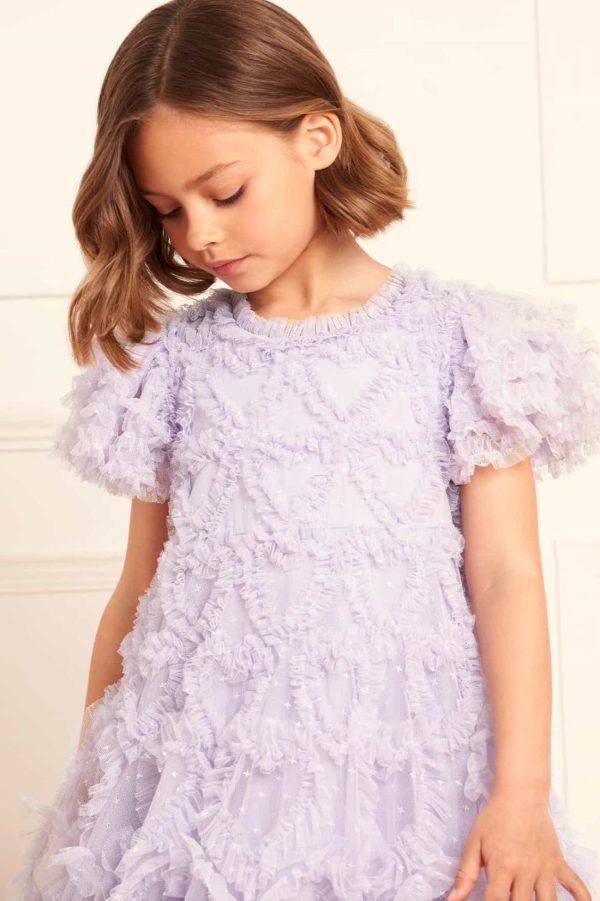 NEW SEASON. The Amorette KIDS Dress in Dusk Lilac. A signature Needle & Thread KIDS dress for the season ahead. Beautifully adorned with a love heart motif,made from gently gathered delicate tulle. Designed with playful,frothy sleeves created by using layers of delicate tulle and frills. Featuring a generous,voluminous skirt layered with tulle and net for a magical silhouette. The perfect mini-me version of our RTW style.
