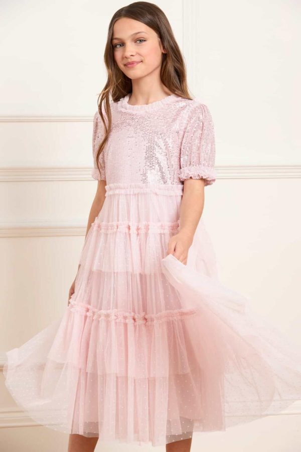The Annalise KIDS Dress in Dusk Pink. This enchanting dress features a shimmering bodice and puff sleeves adorned with sequins for a glittering finish. Signature Needle & Thread tulle frills trim the neckline,cuffs,shoulders,and waist for a romantic touch. The playful tiered skirt,crafted from soft net and tulle with frothy topstitched ruffles,flows into a sweeping hem—perfect for twirling. A whimsical statement dress for sparkling moments.