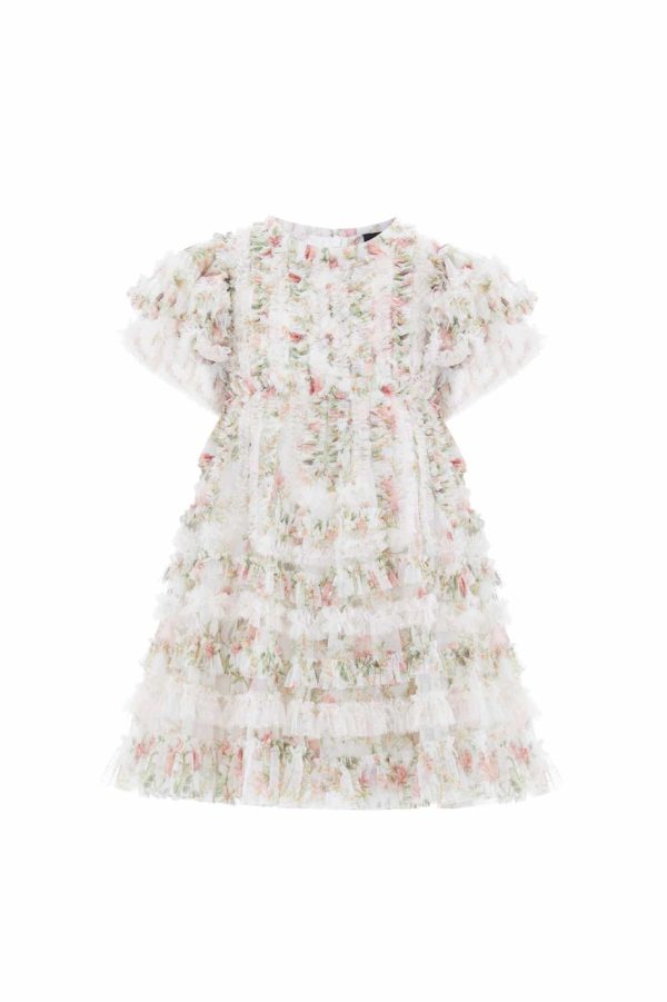 NEW SEASON. The Colette’s La Vie En Rose Short Sleeve Kids Dress in Moonshine/Cream. A frothy,romantic style featuring softly gathered frills and a printed floral base. This mini version of the women’s gown brings dreamy elegance to any special occasion. Ideal for picture perfect family moments with the matching Colette’s La Vie En Rose Gown.