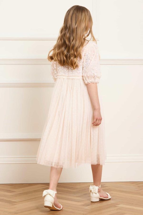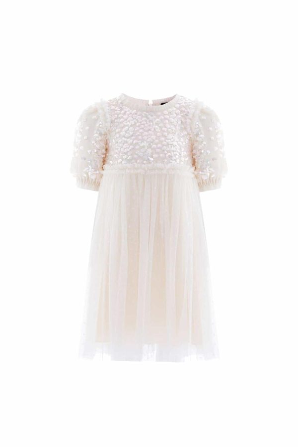 The Confetti Bodice KIDS Dress in Cream. This dreamy dress is full of sparkle and magic. The bodice is sprinkled with delicate sequin dots and sweet floral motifs,creating a fun confetti effect. The structured puff sleeves add a touch of princess drama,while the voluminous tulle skirt is made for endless twirls. Soft,signature Needle & Thread tulle frills decorate the neckline,shoulders,and waist,adding an extra sprinkle of fairytale charm to this playful and elegant dress.