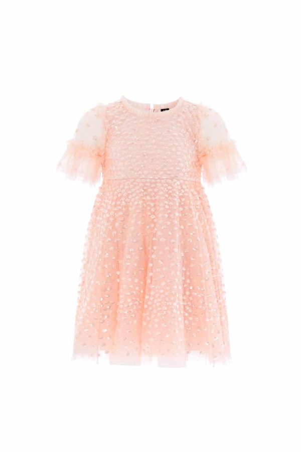 NEW SEASON. The Scatter Dot Kids Dress in Apricot features shimmering dot motifs that fade towards the hem for a glittering effect. Crafted with high-shine sequins and delicate Needle & Thread tulle frills at the neckline,shoulders,and waist,it offers a frothy,romantic look. Crafted with fluted sleeves with soft frills and sparkling dots complement the voluminous tulle skirt,perfect for twirling.