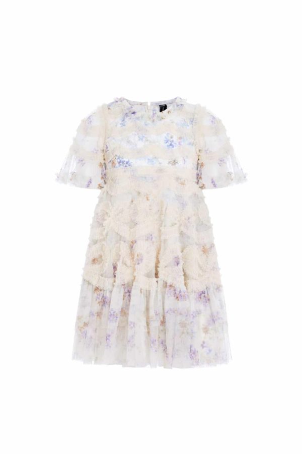 The Ophelia Ditsy Ingrid Kids Dress in Moonshine/Blue. This statement dress features Needle & Thread’s signature ribbon bow motif,crafted in delicate tulle with subtle texture. A whimsical ditsy floral print,inspired by early 1900s hand-painted artwork,gives it a soft,floating feel. With a round neckline,floaty sleeves,and timeless design,it’s a must-have for your little one’s special occasions.