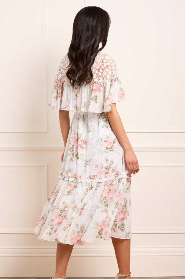 The Madame Rose Carla Chiffon Cape Ballerina Dress in Moonshine. This ethereal dress features an exquisite 1850s-inspired print,showcasing luxurious rose bouquets and intricate scroll details. Crafted from the softest chiffon,it is enhanced by printed tulle panels at the yoke and sleeve head,embroidered with delicate floral motifs. A short integrated cape with a frill tier adds a dramatic yet romantic touch,while the neckline and cape are adorned with signature Needle & Thread frills,finished with tiny pin hems. The softly gathered skirt hem tier is decorated with a chiffon ruffle,completing the graceful silhouette. A slim self-fabric waist tie offers versatility,allowing for a personalised fit.