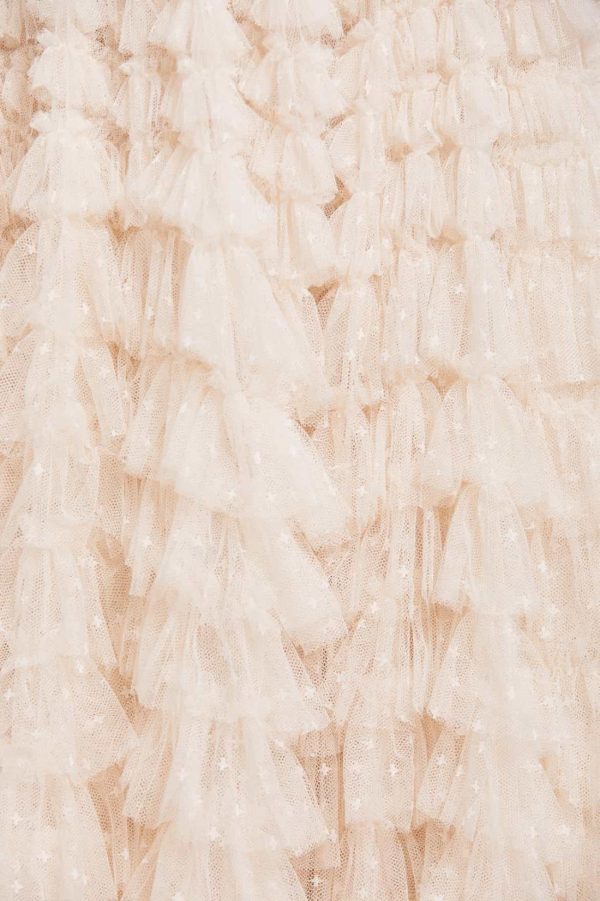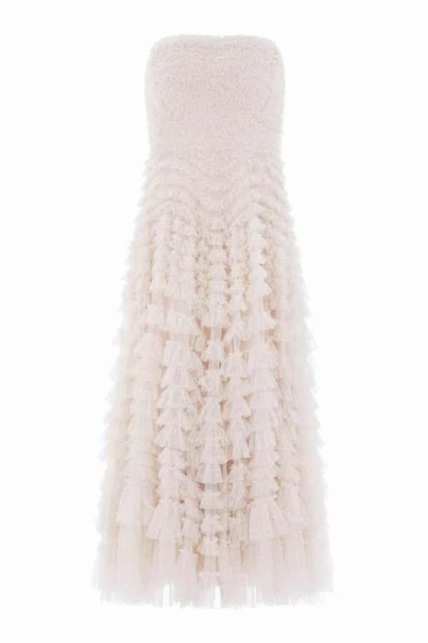 The Hattie Ruffle Strapless Ankle Gown in Cream. This gown is elegantly developed with layers of frothy tulle creating a soft,wavy textile. This strapless gown features signature Needle & Thread ruffles and frills for intricate,romantic detailing. Make the ultimate statement in the Hattie at your next event.